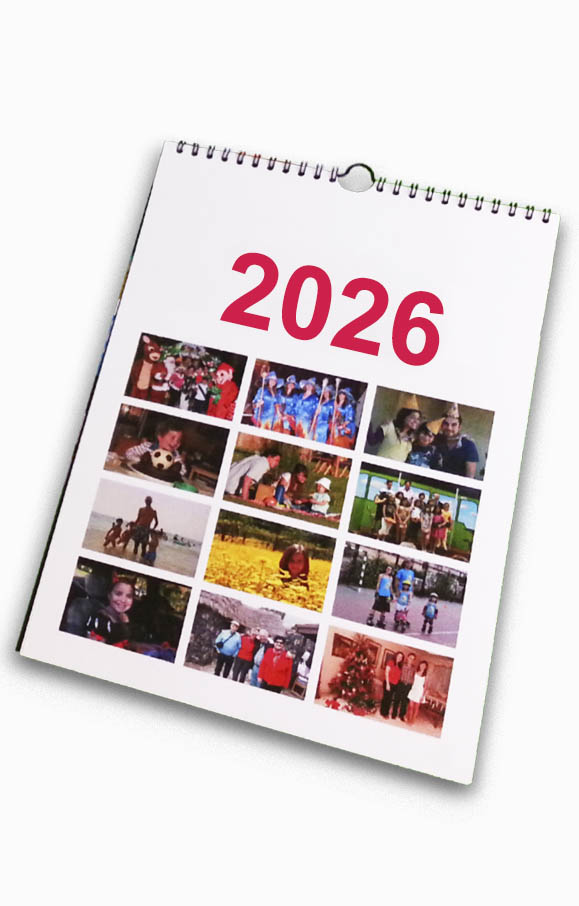 Calendarios Pared A3 – Soporte offset de 160 grs.-, encuadernación en wire negro, gancho para colgar a la pared, portada laminada en brillo.